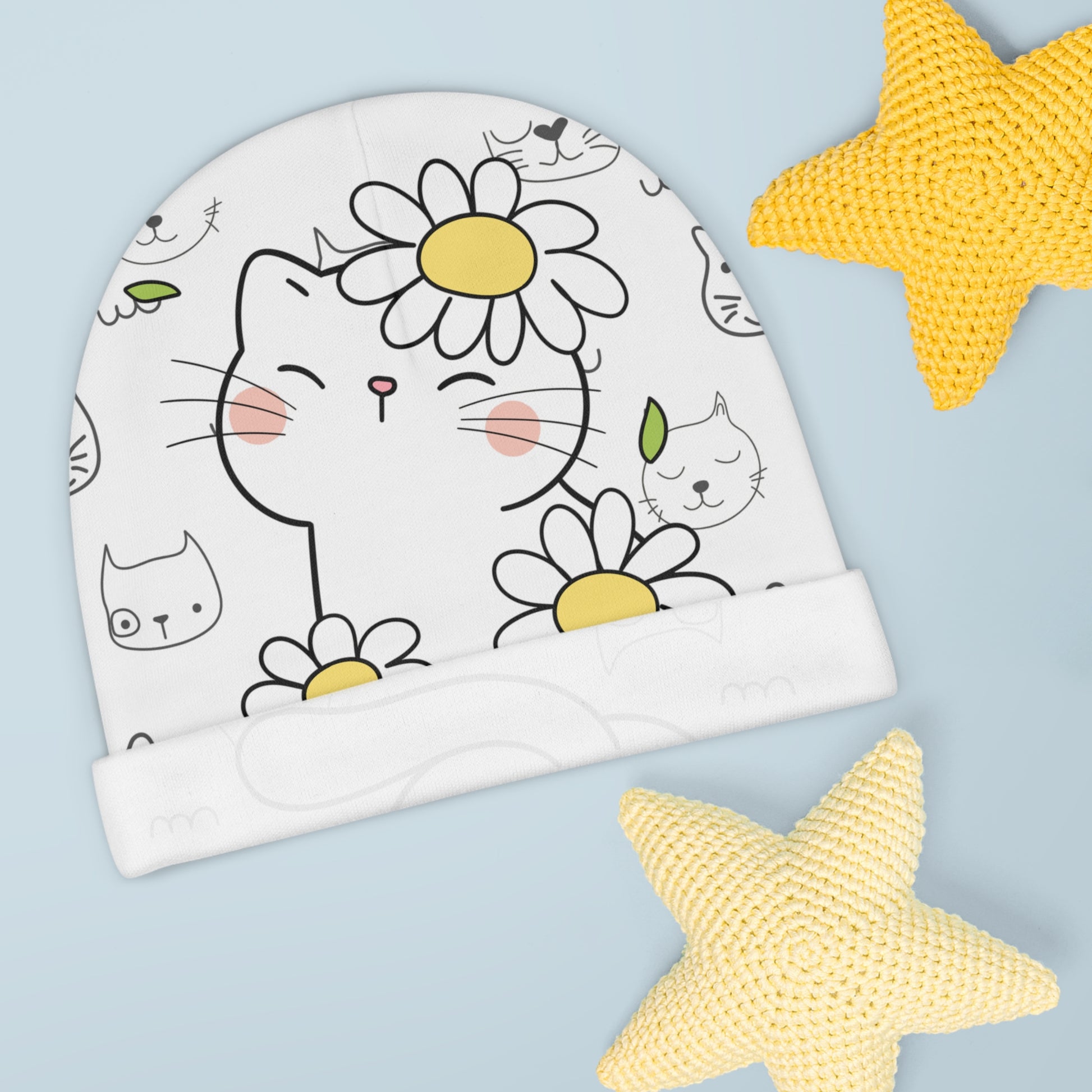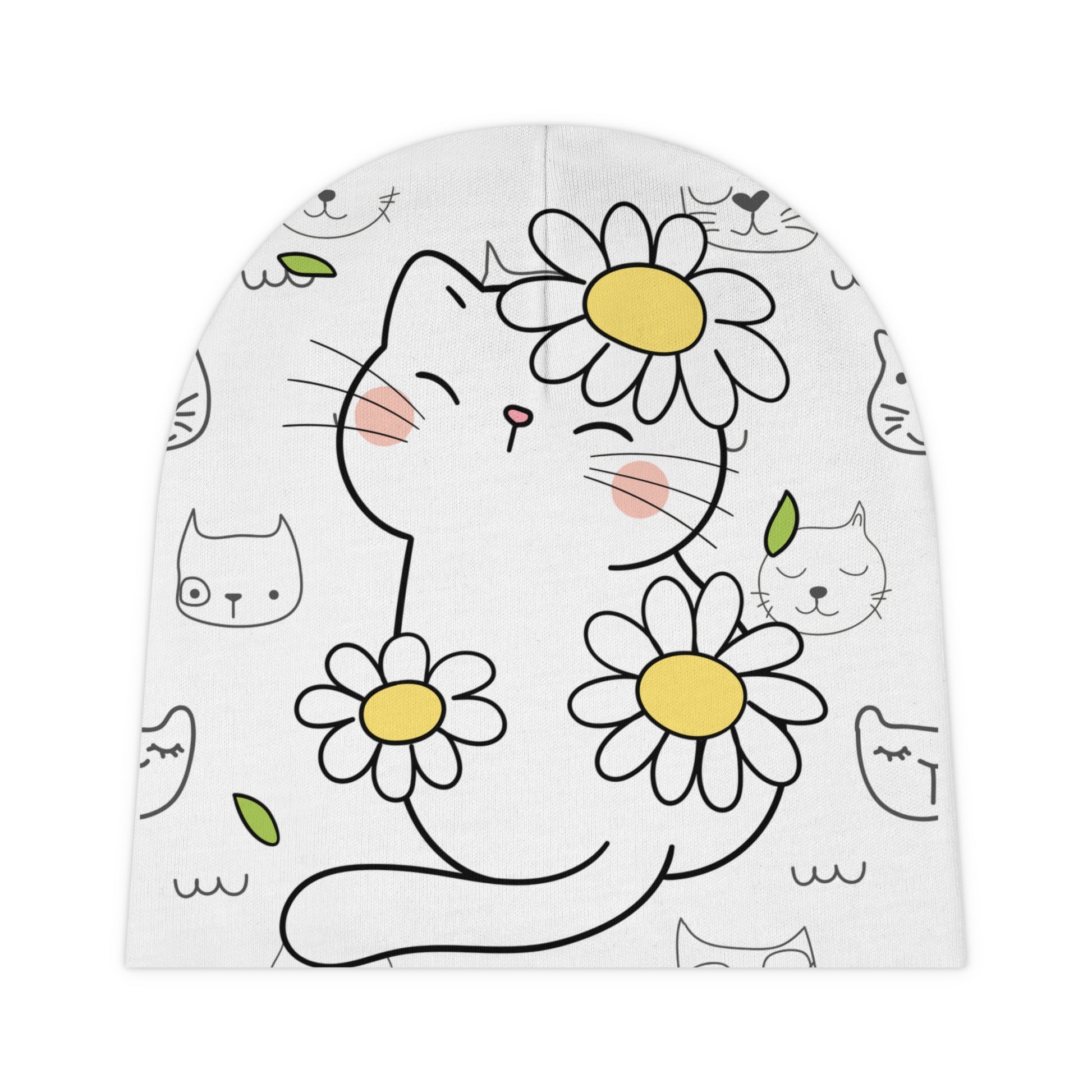 Soft, sunny, and just a little mischievous — this baby beanie wraps tiny heads in a playful world of daisies and sleepy cats. Lightweight interlock knit lets it stretch and settle gently while the cheerful illustration peeks out from every angle. Picture a stroller walk on a bright morning: the beanie tucks over little ears, the pastel blush on the kitten’s cheeks catching the light, and the simple daisy motif adding a touch of whimsy to everyday outfits. It’s for caregivers who love sweet, hand-drawn charm and want a cozy, low-fuss layer for newborns during springtime outings, family photos, or quiet mornings at home.