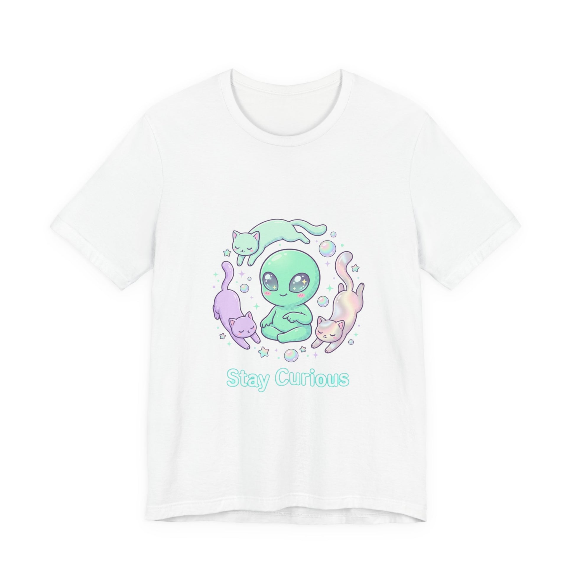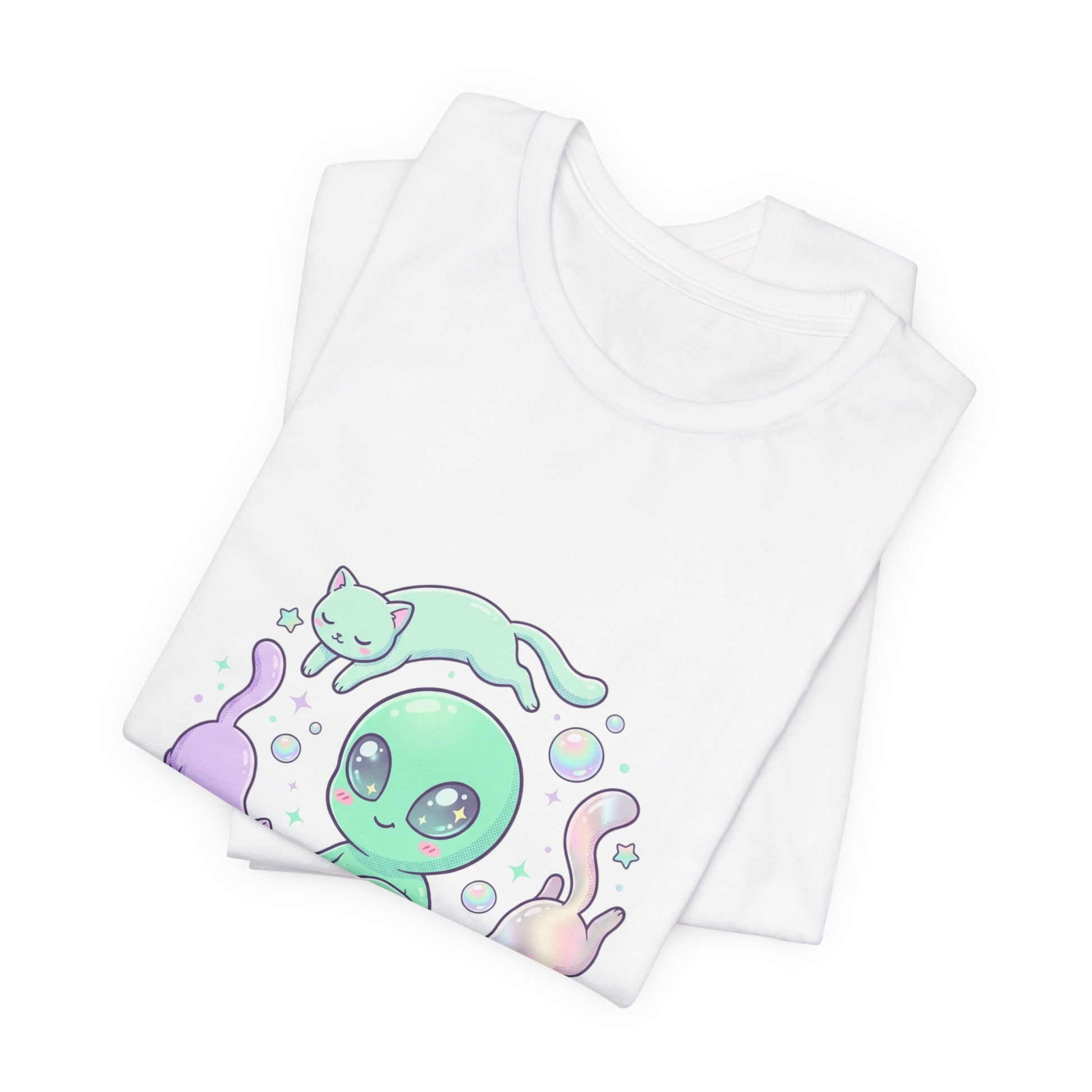 Soft pastel alien illustration centered on a lightweight white tee, blending mint and lavender gradients with pearly highlights for a gentle extraterrestrial vibe. The artwork shows a rounded, friendly alien surrounded by floating opalescent bubbles and three playful pastel cats, using smooth linework and soft fills to match the ‘Soft Alien / Extraterrestrial Aesthetic’ trend. Subtle iridescent-style shading and minimal, rounded lettering reinforce a dreamy, curious mood that fits casual wardrobes and everyday layering. Product features - 100% Airlume combed and ring-spun cotton (Bella Canvas 3001), lightweight 4.2 oz/yd² (142 g/m²) - Retail crew neckline with ribbed knit collar and shoulder tape for shape retention - With side seams for structural support and longer garment shape - Sleeve and neck label printing primarily via DTF/DTG methods for crisp, vibrant prints - Age: adults; REACH certified; sourced from Honduras Care instructions - Machine wash: cold (max 30C or 90F) - Non-chlorine: bleach as needed - Tumble dry: low heat - Iron, steam or dry: medium heat - Do not dryclean